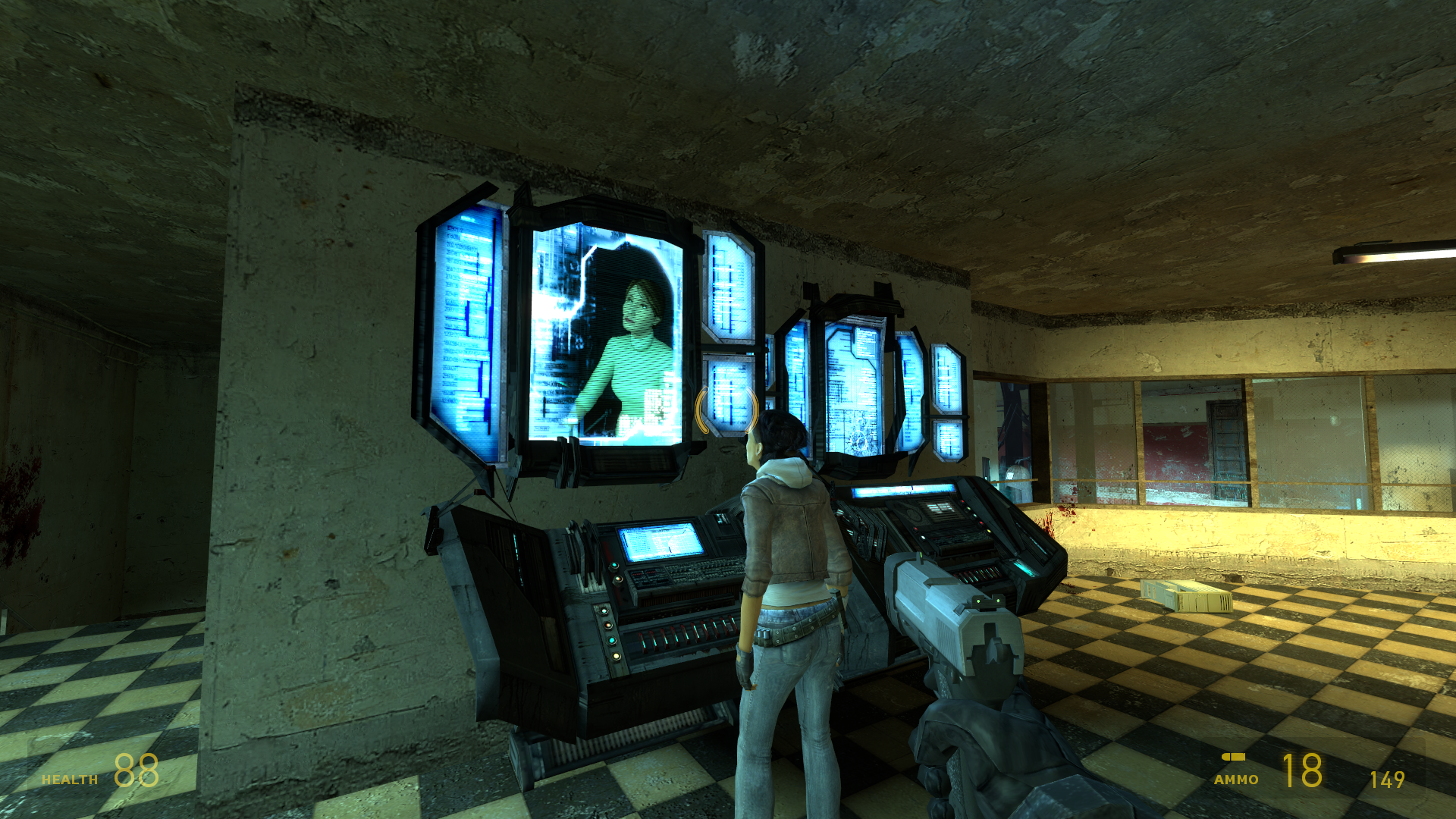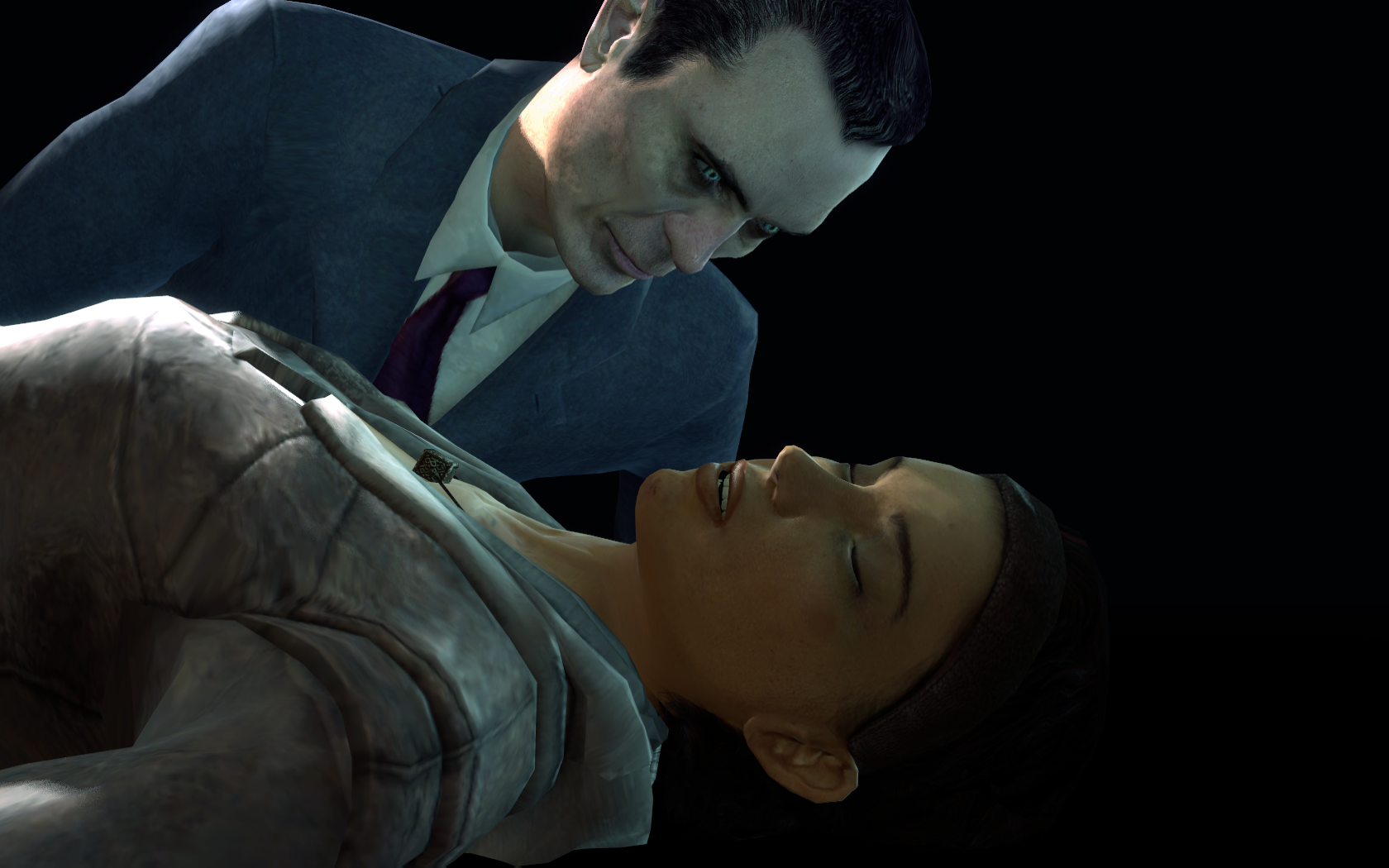 Nonetheless, the Combine has pursued us from the moment we stepped foot in this world, but now we're going after them. It doesn’t pan out: before we can rescue Eli Vance a traitor is revealed, threatening to derail our efforts. Judith Mossman is a double agent, spying on the Resistance on Breen’s behalf. It’s Alyx who discovers this, and the betrayal cuts deep. On the one hand, she uses it to justify her personal antipathy towards Mossman, but on the other, Eli and Mossman clearly had a romantic relationship, and she knows it’s going to break her father’s heart. Briefly, Mossman refers to us as "someone's puppet", but the remark is unexplained, and the argument moves on. The G-Man briefly flickers in our consciousness.
