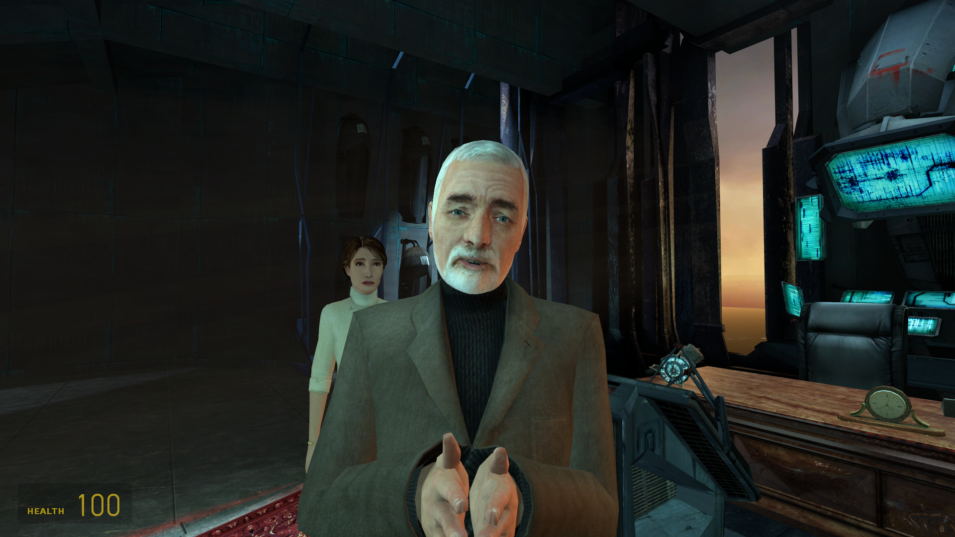 Actually, I’d like to take a quick opportunity to talk about Mossman here, mostly because she’s HL2’s most underserved character, despite having what I would argue is the strongest dramatic arc. I know that sounds contradictory, but it's true. Unlike the rest of the cast, Mossman’s allegiances are conflicted, and she’s torn between Breen’s persuasive rhetoric, the Resistance’s scientific idealism, and her love for Eli. I still find it pretty powerful when she attempts to convince Breen of the importance of keeping Eli alive. Unconvinced, Breen proceeds to condescend to her about her “feelings” impairing her judgement. His willingness to talk right over her reveals the character’s grotesque misogyny, and Mossman’s defeated body language at the end of the scene absolutely tells us she’s experienced this bullshit so many times. "So sorry, Judith," says Breen, dry and mocking. "I'm all out of time."