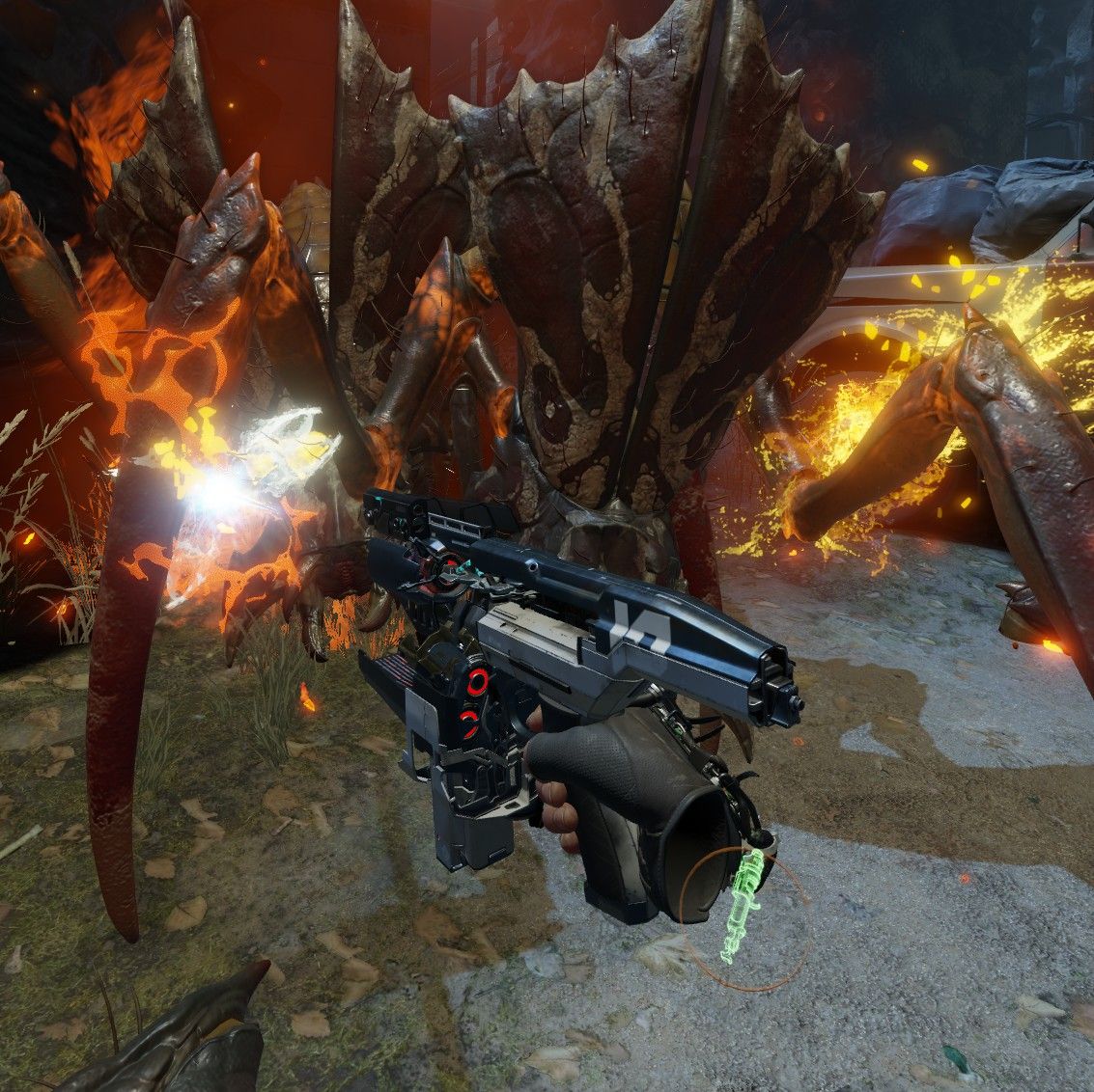 At one point I took temporary shelter in a hut, hastily extracting the health canister from my glove and pushing it into a charger station. Bullets peppered the window as I pulled the lever, and I could hear antlions closing in. As the little needles did their work on my hand – no small task, given I had half a heart left – I turned my head, pointed my pistol at the door, and blew away the antlion charging towards me. Pistol ammo depleted. Nearly three full hearts, but not quite. A second antlion came into view, and I went to switch to my shotgun, cursing the charger’s speed...only to see that the antlion had lost both legs, and was struggling past the hut, mostly harmless. I relaxed, and lowered my arm. Full health.