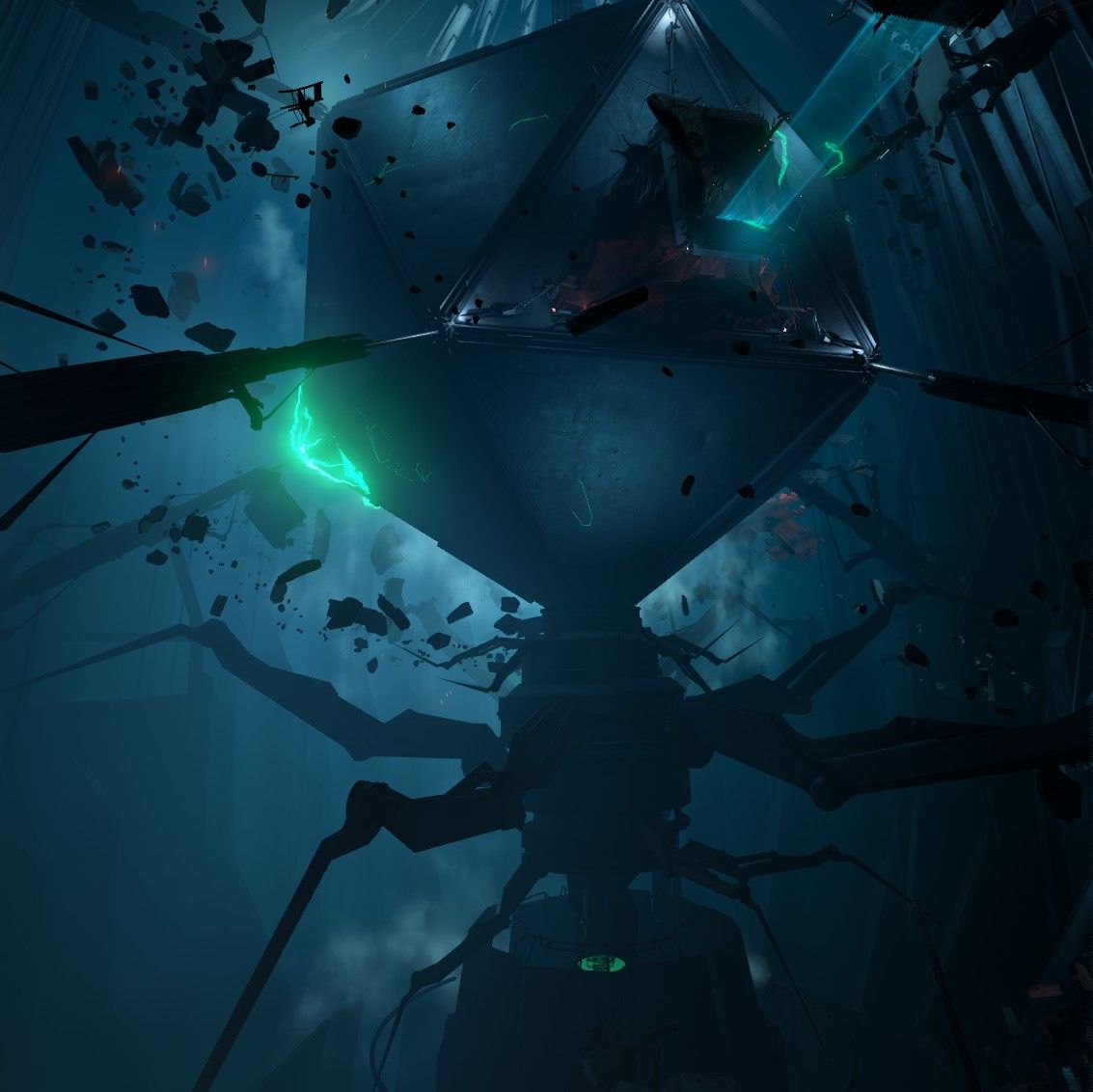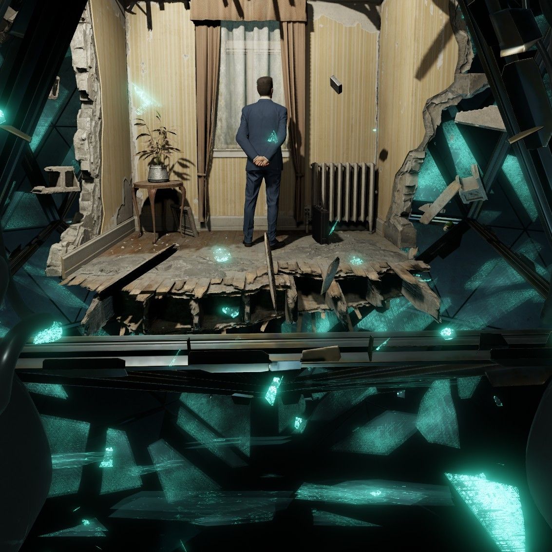 Beyond, a vast chamber containing a bizarre structure surrounded by floating debris is revealed. At the heart of this structure is a single room occupied by a lone figure. Alyx severs the prison’s power supply, and the structure shatters. “Gordon...Freeman?” she asks, uncertain, even a touch afraid.